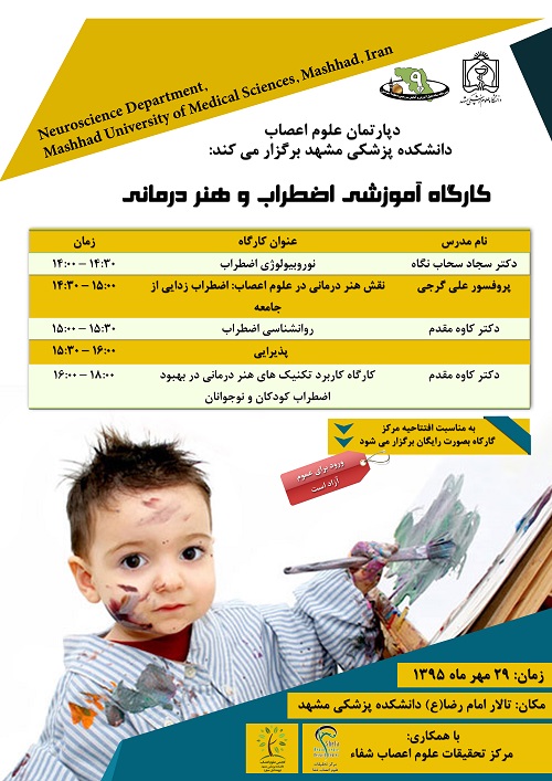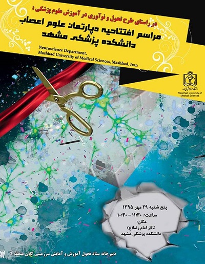 در راستای طرح تحول و نوآوری در آموزش علوم پزشکی، دپارتمان علوم اعصاب در دانشکده پزشکی دانشگاه علوم پزشکی مشهد افتتاح شد. مراسم افتتاحیه این دپارتمان در تاریخ پنجشنبه 29/7/1395 از ساعت10:30 الی 11:30 در محل تالار امام رضا(ع) دانشکده پزشکی برگزار گردید. پس از مراسم افتتاحیه نیز کارگاه آموزشی تحت عنوان اضطراب و هنردرمانی توسط پروفسور گرجی رئیس دپارتمان علوم اعصاب و سایر اساتید به شرح ذیل(به صورت رایگان و عمومی) برگزار شد.